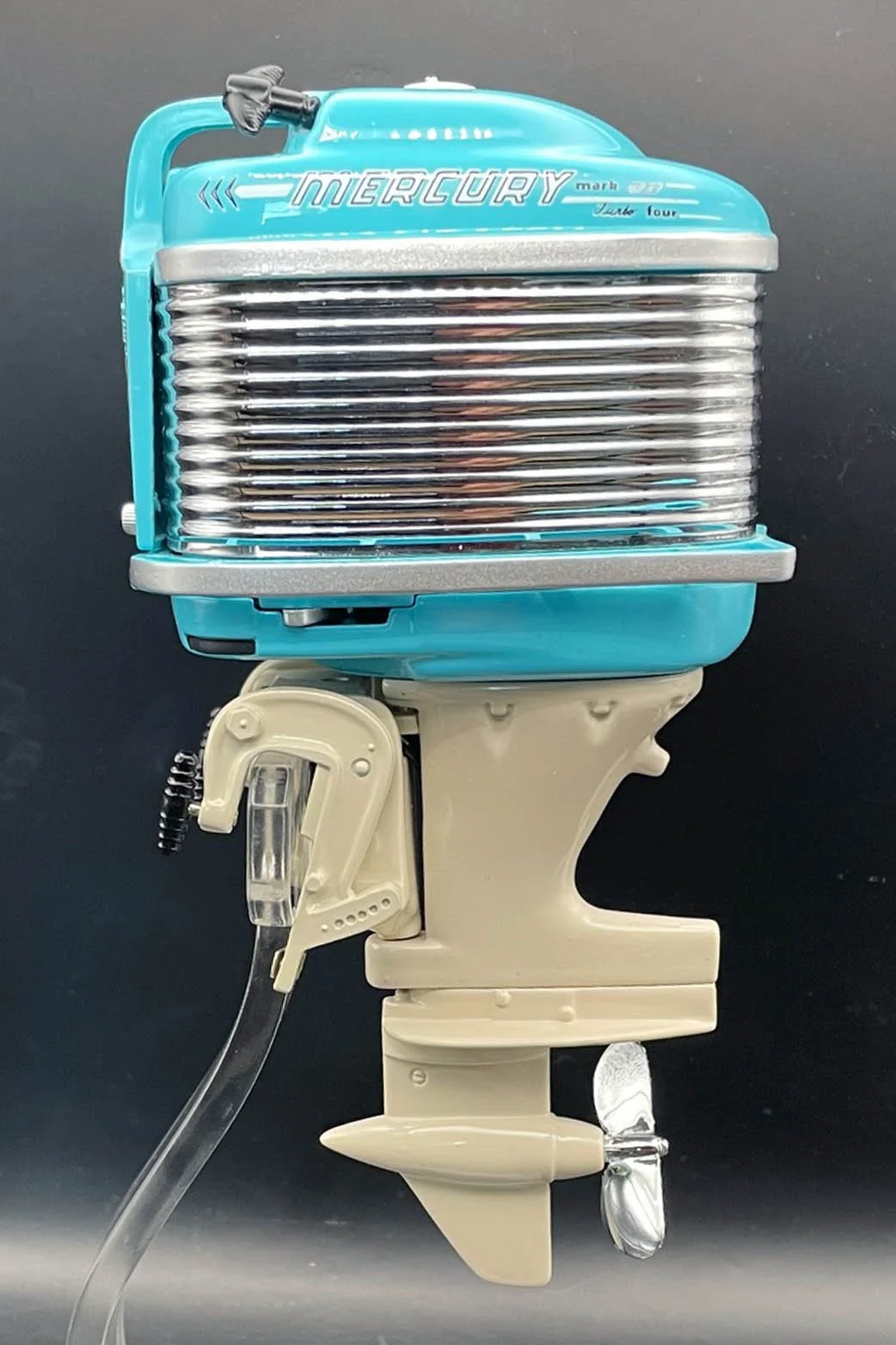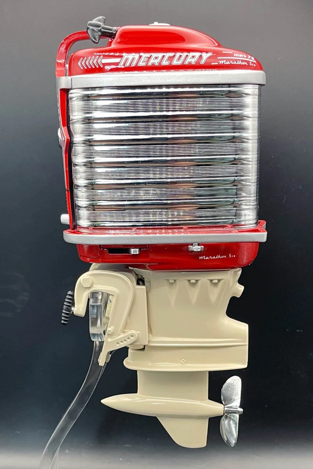 The Sunset Orange version is estimated to be the rarest model with only 65-75 models made. The Mark 75 motors are crafted in 1:8 scale, and measure 7 inches tall. Inside the cowl is a very detailed six-cylinder powerhead. An additional unmatched detail is the pull cord handle the actually “pulls” and auto retracts just like the real outboard.