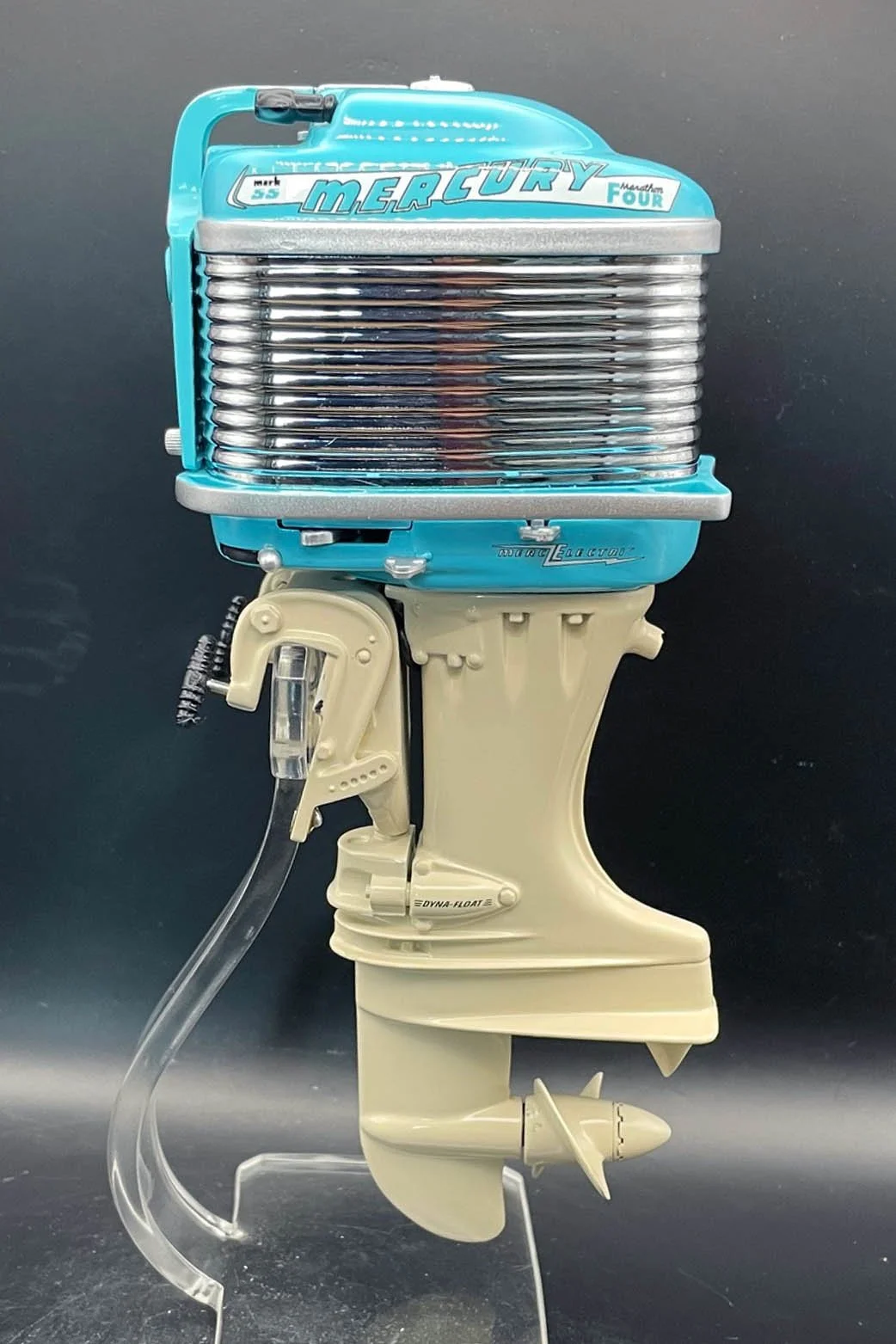 The Mark 55H motor is crafted in 1:8 scale, and measure 5 inches tall. The ribbed cowl wrap is removed on this version and showcases the unique four-cylinder powerhead with Quincy Pipes. An additional unmatched detail is the pull cord handle the actually “pulls” and auto retracts just like the real outboard. This motor is the most sought after and valuable Alterscale made.