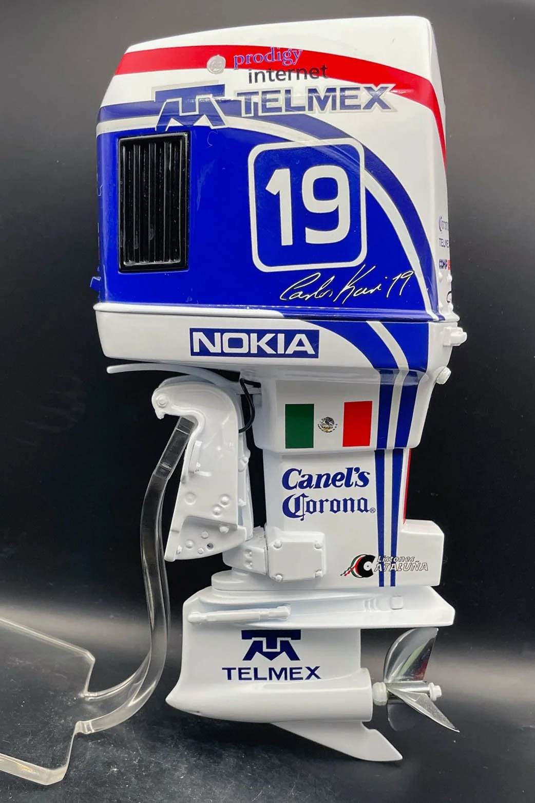 The TELMEX Evinrude was the last V8 version made in the first series of outboards produced under the original Alterscale owner Karl Beisel. This motor was only produced in white with Carlos Kuri logoed graphics. The TELMEX motor came with a preinstalled red velocity stack V8 motor. This motor also came in a custom branded box with full color motor graphics.
