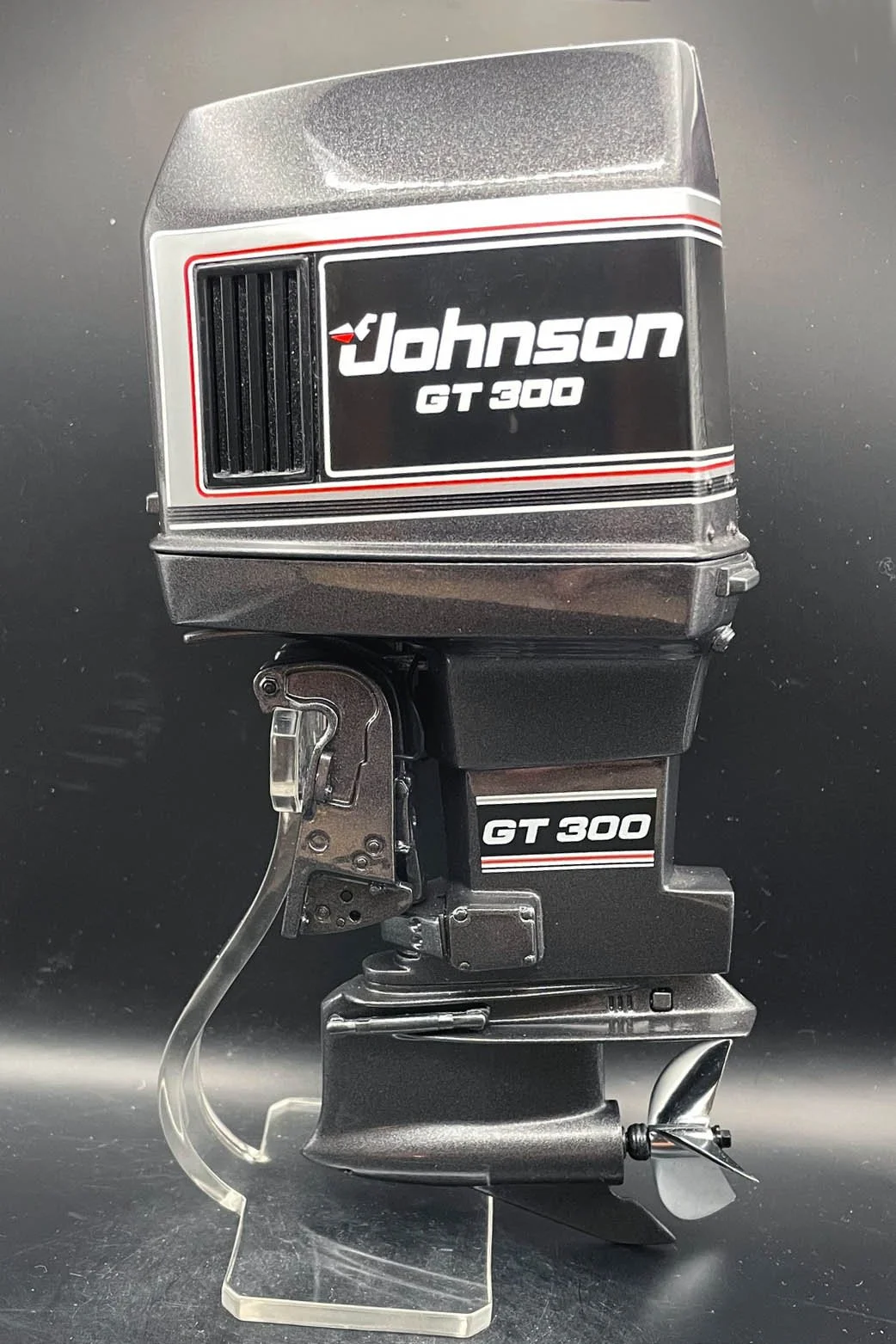 The Johnson GT 300 was in the first series of outboards produced under the original Alterscale owner Karl Beisel. This "Gray Panel Hood" version was the very first Alterscale offered. The later "Black Panel Hood" was the corrected version of this motor. The missing black color on the cowl was an oversight and not an intended variation of this motor.