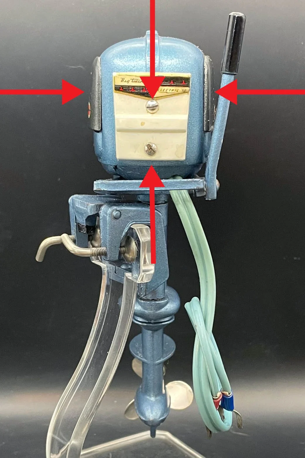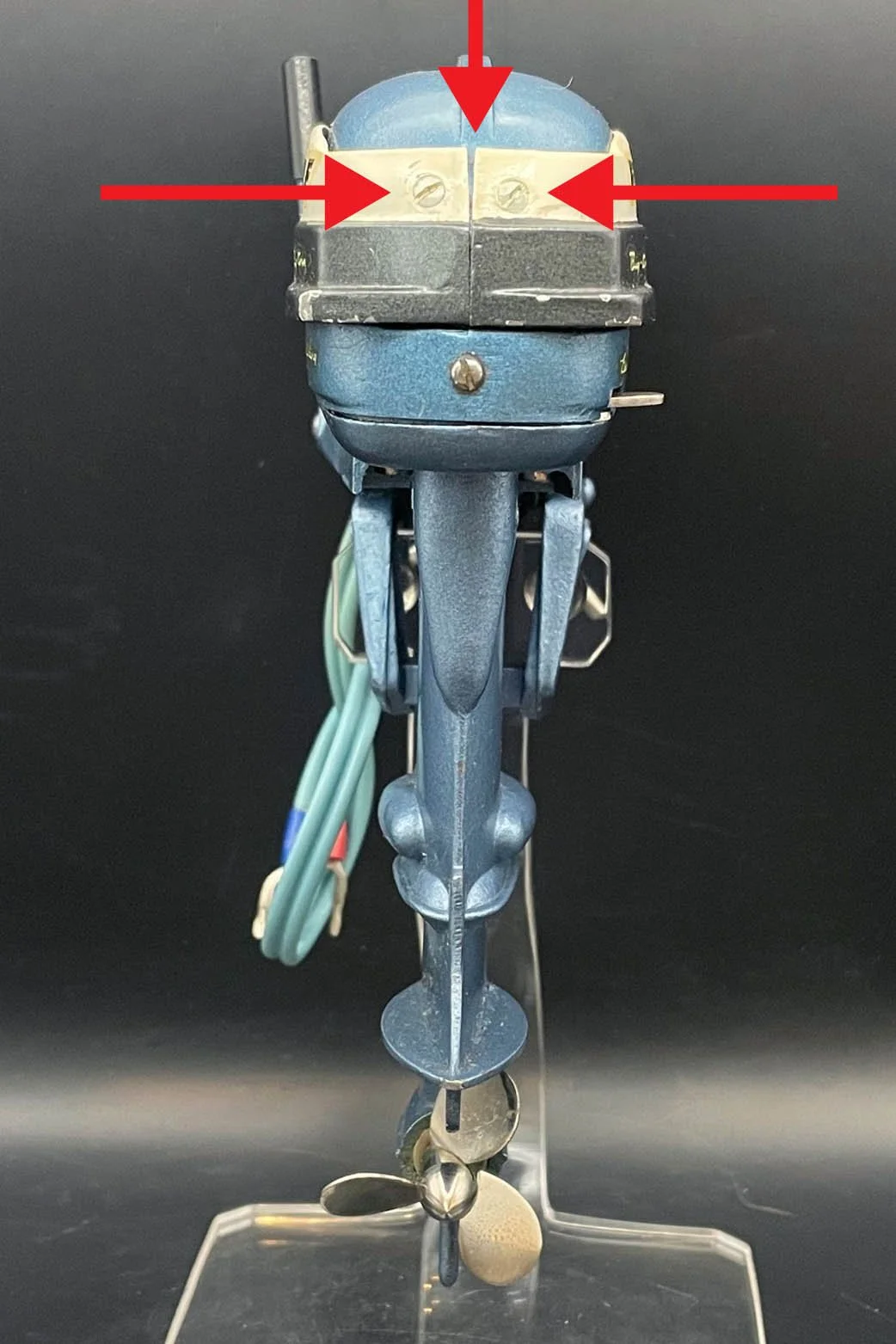 1956 Evinrude - Gen 3 - Back: White portion and dark gray trim are one cast piece screwed to the cowl, no space between white portions