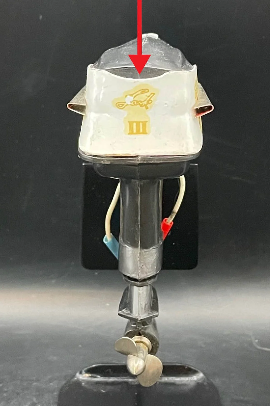 1961 Evinrude - Gen 1 - Port: Cowl wrap is a decal. These were often damaged in shipping so, the wrap was upgraded to a metal wrap as seen in Gen 2