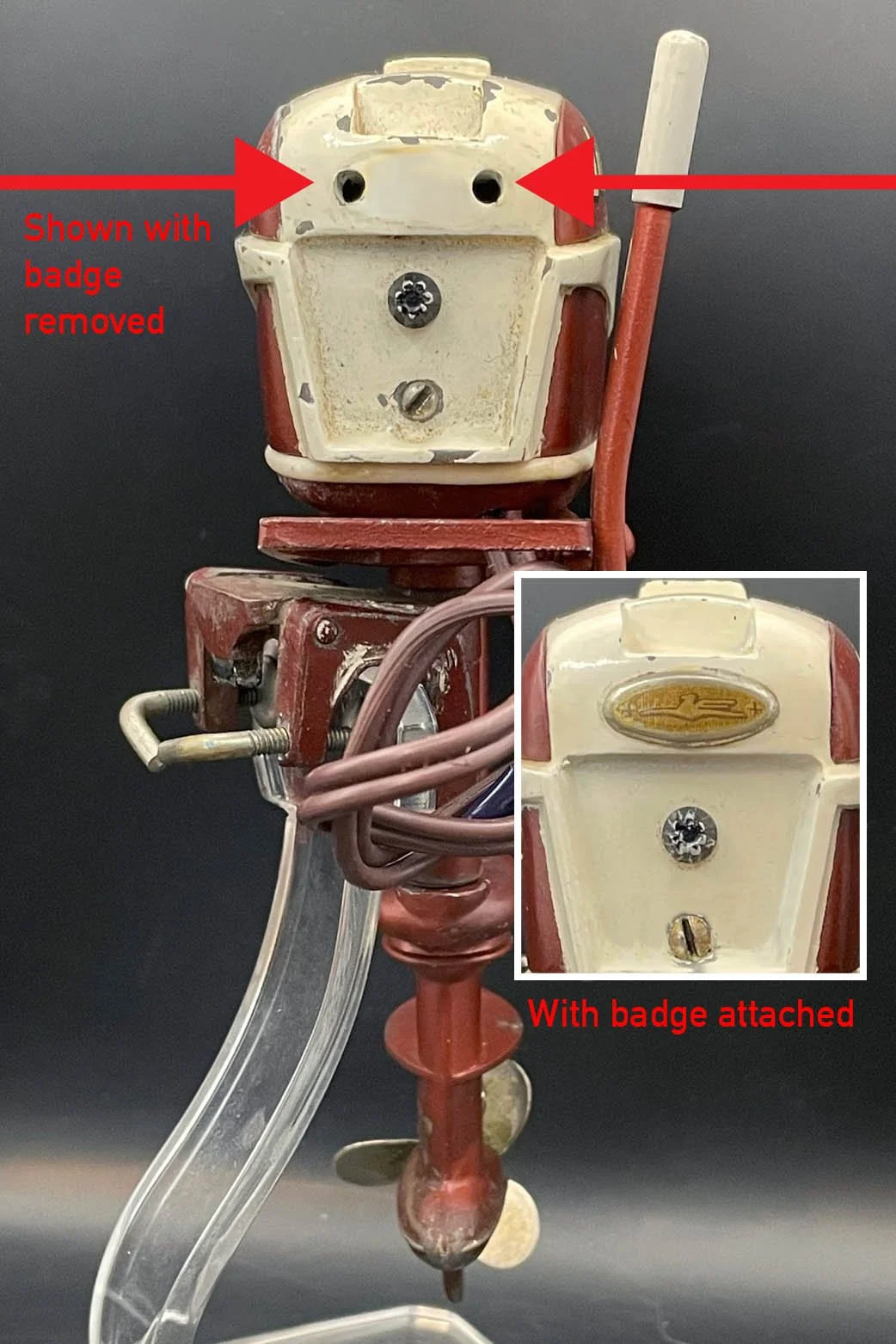 1957 Johnson - Gen 2 - Port: Nameplates glued on, no mounting screws (note: both sides of cowl used same nameplate mounting technique - you can also see raised faceplate badge from side view)