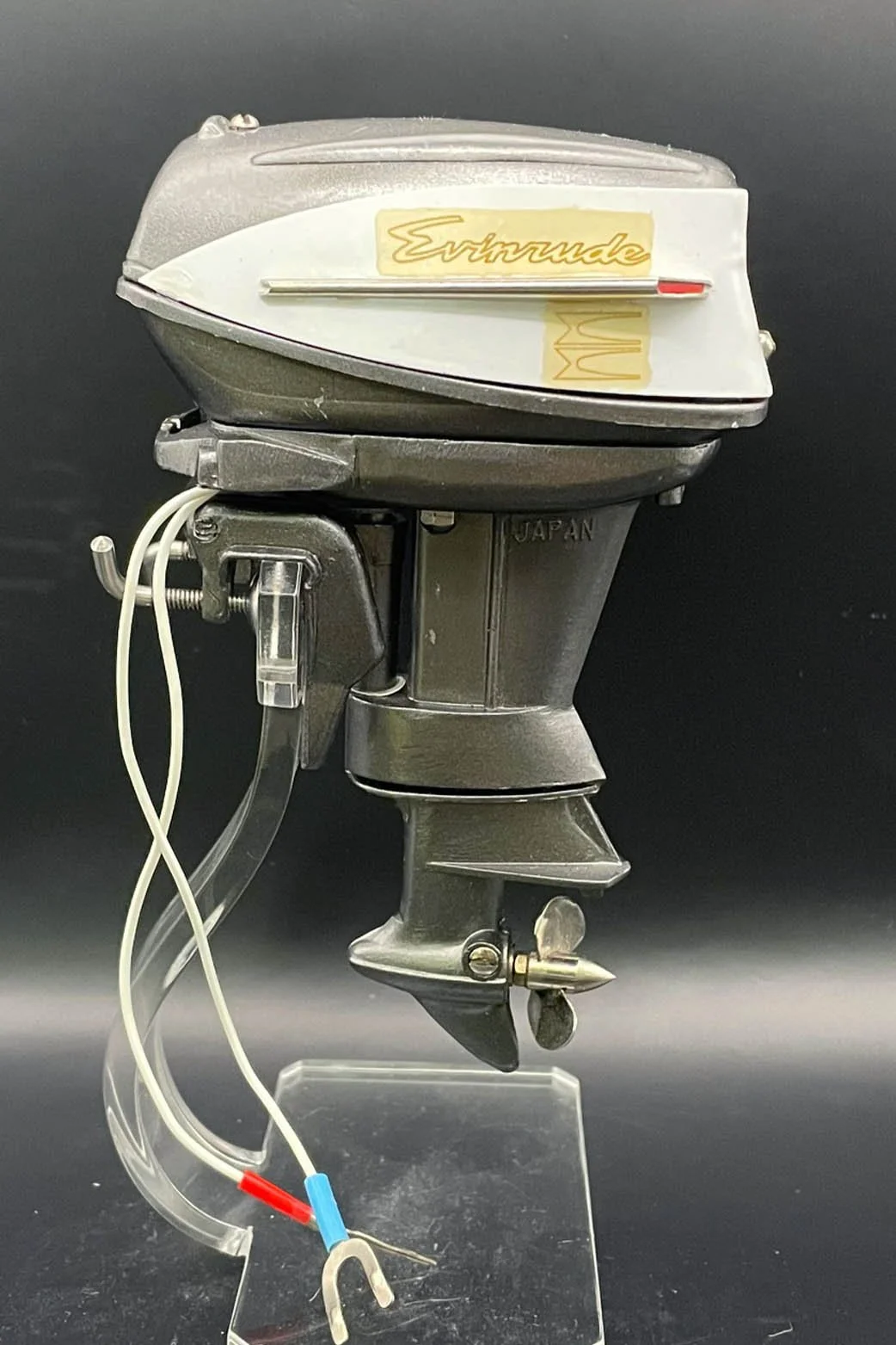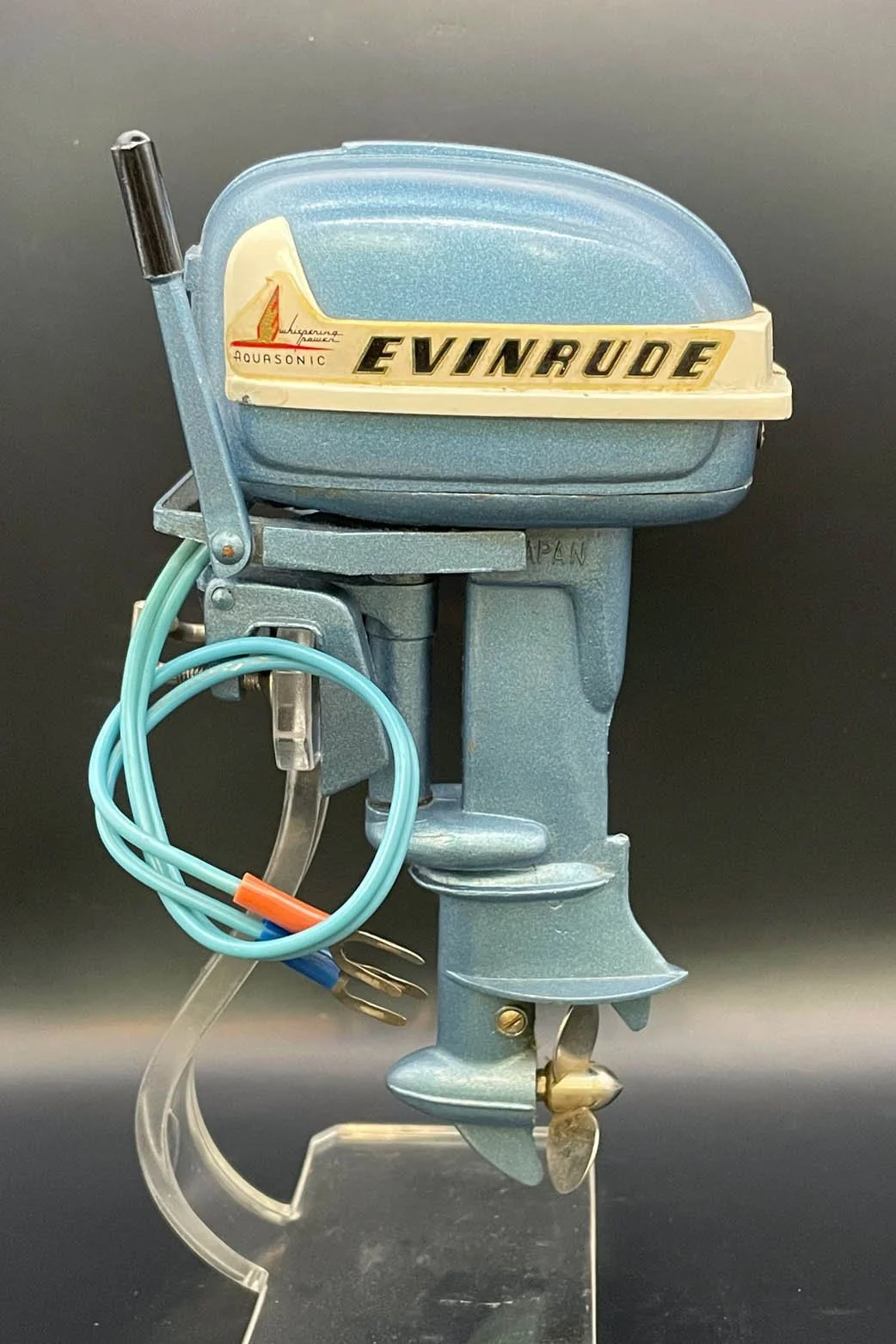 Offered in a brown box with blue “Evinrude Outboard Motors” graphics, instruction sheet, white tin and wood stand, blue battery wires and metal battery post terminals