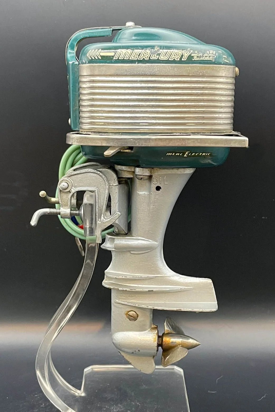 The first of three different paint combinations available, the green and silver version is the second most rare 1956 K&O Mercury. Model year updates are the “arrow” Mercury logo, two cavitation fins, and a painted narrowed faceplate. All three 1956 Mercury motors are rarer than the 1955 but, they are not considered a rare motor.