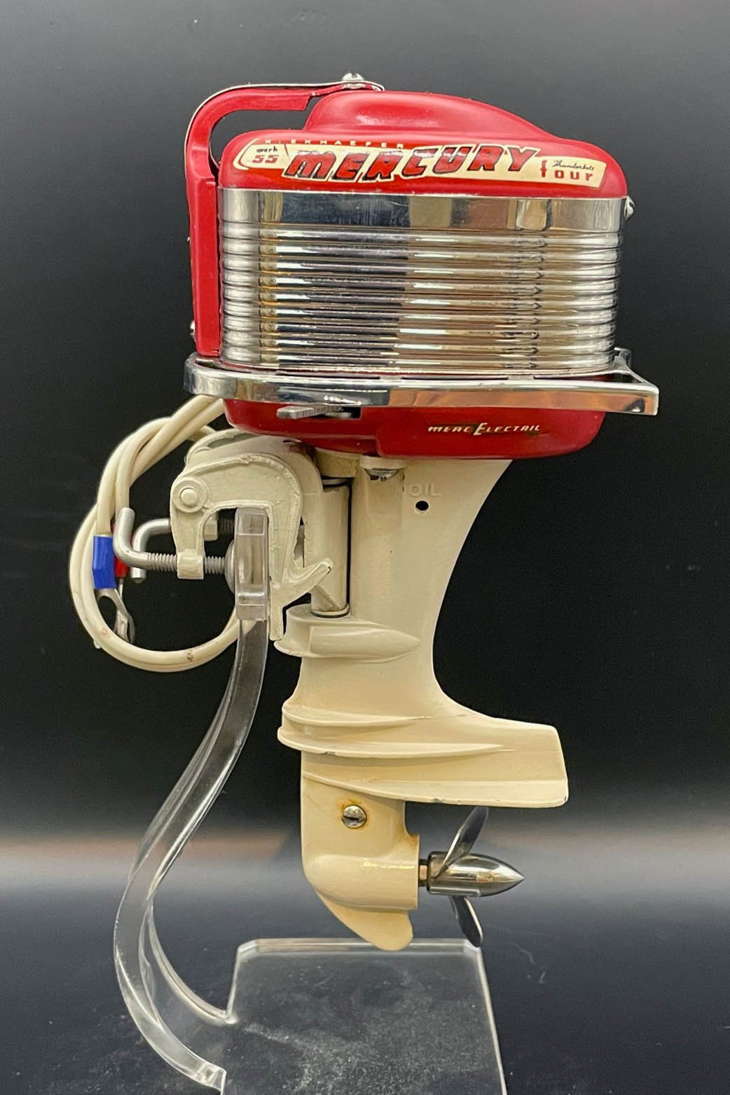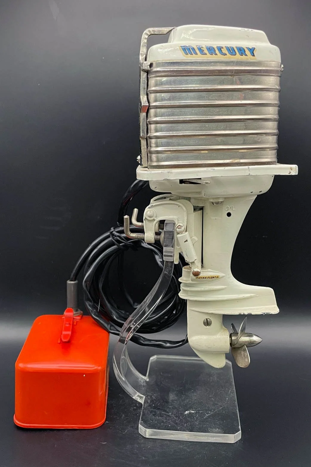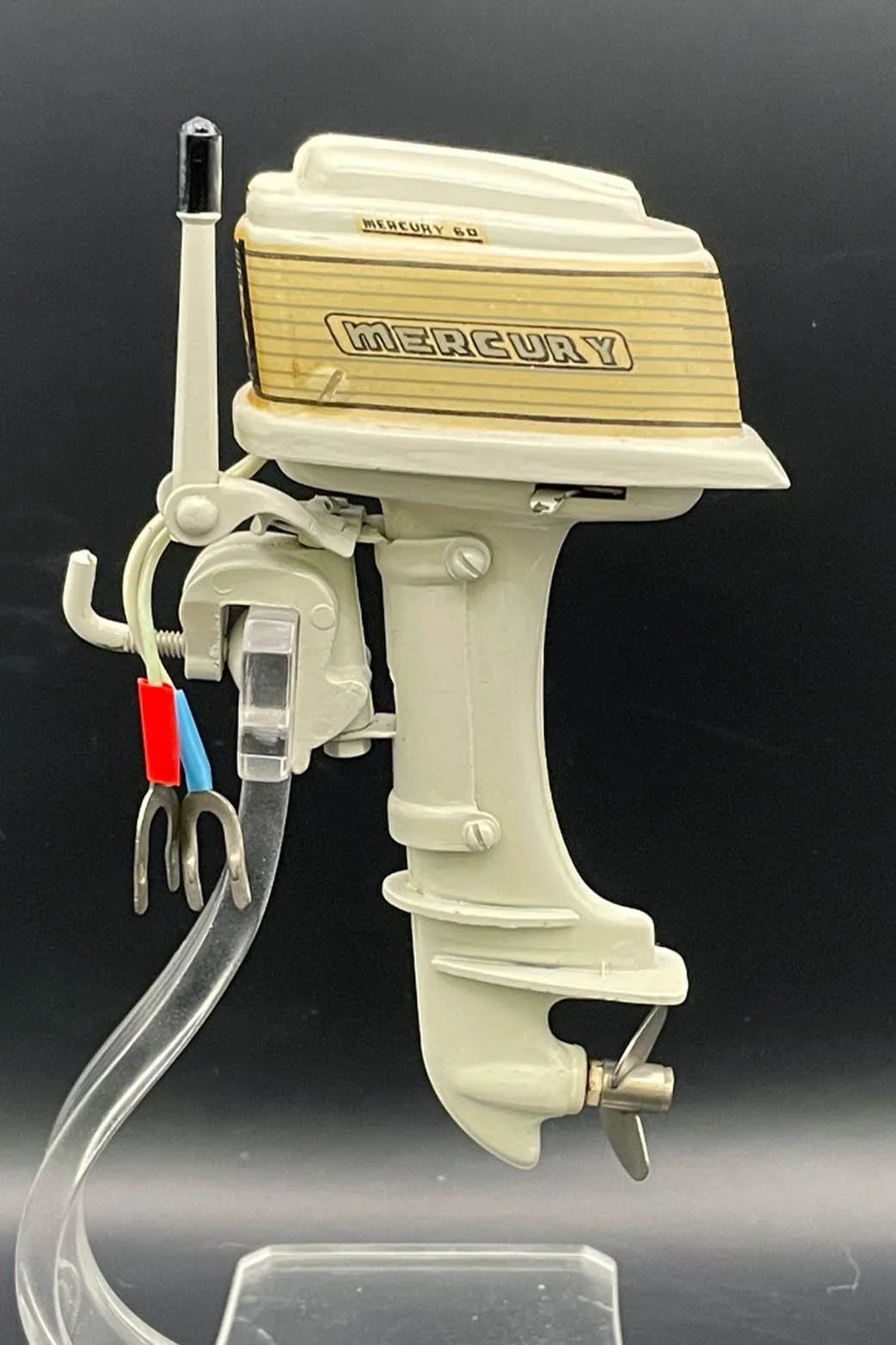 The Mark 78A with “Gas Tank” is one of two “large” 6-cylinder Mercury’s offered by K&O for 1959. This motor was also named and marketed as the “Drink Mixer”. The Mark 78A with “Gas Tank” was originally sold as a novelty drink mixer, not a toy. This motor would sit on the rim of your glass and mix your drink. (Probably not a good idea as these motors generally leaked oil!) The drink mixer motor shared the same design as the 1959 Mark 78A and came with a small red “gas tank” that housed the motors batteries. The battery wire was also a thick single black cable that plugged into the gas tank with a stereo-jack style connector. This was the only motor offered by K&O with this battery pack configuration. This Mercury is much rarer than the 1959 Mark 78A and is very highly desired. The battery “gas tank” is usually missing and can be very hard to find on its own. Like many 6-cylinder Mercury motors these are very rarely seen for sale and highly sought after.