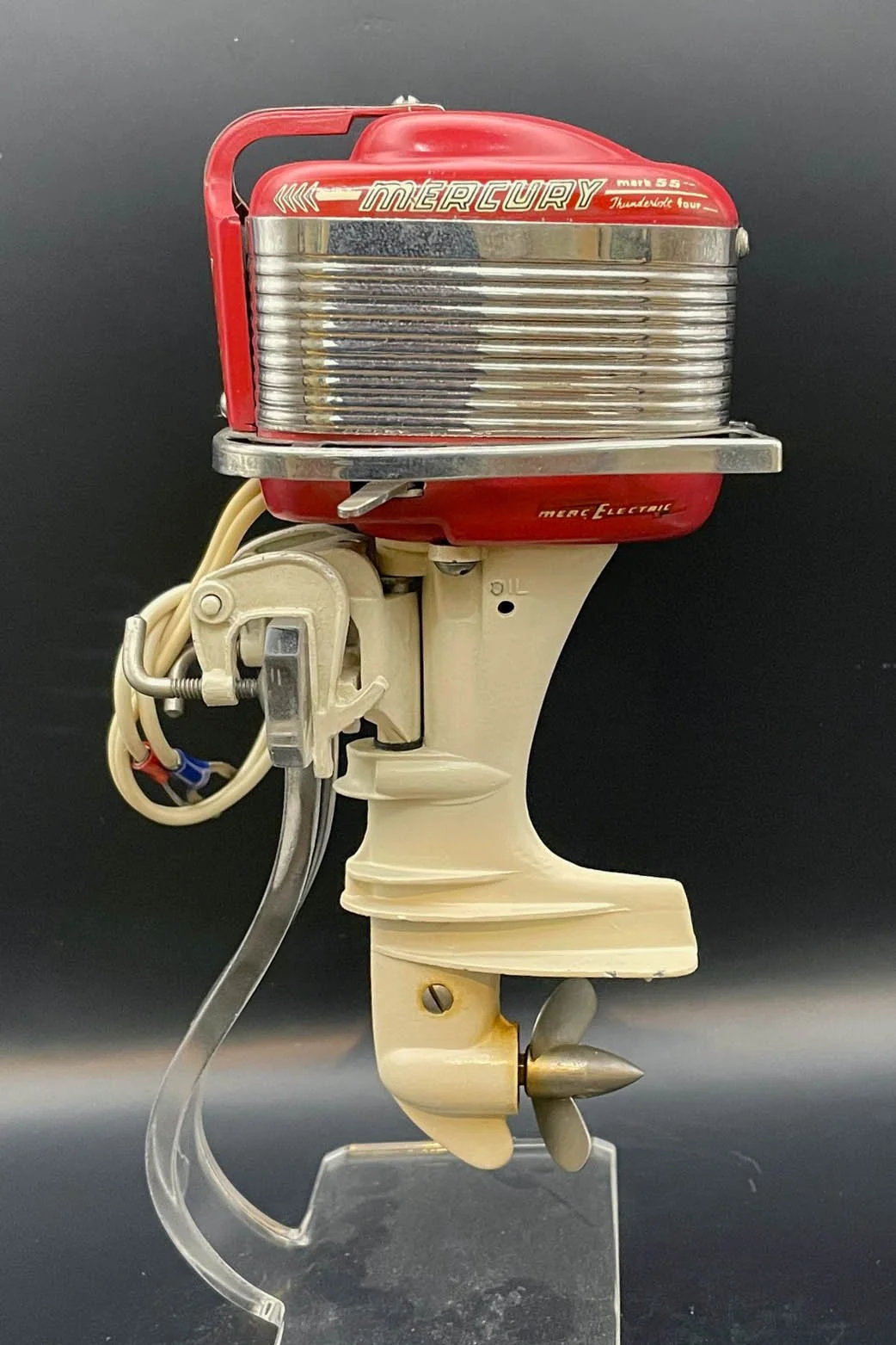The red (sunset orange) and sand color Mark 75 motor is the first mass-produced “large” 6-cylinder Mercury. Unlike the cream-colored Merc, this version had a real-life counterpart color scheme that was offered by Mercury. This Mercury is not a rare motor but, it’s rarely seen for sale as owners tend to keep them once acquired.