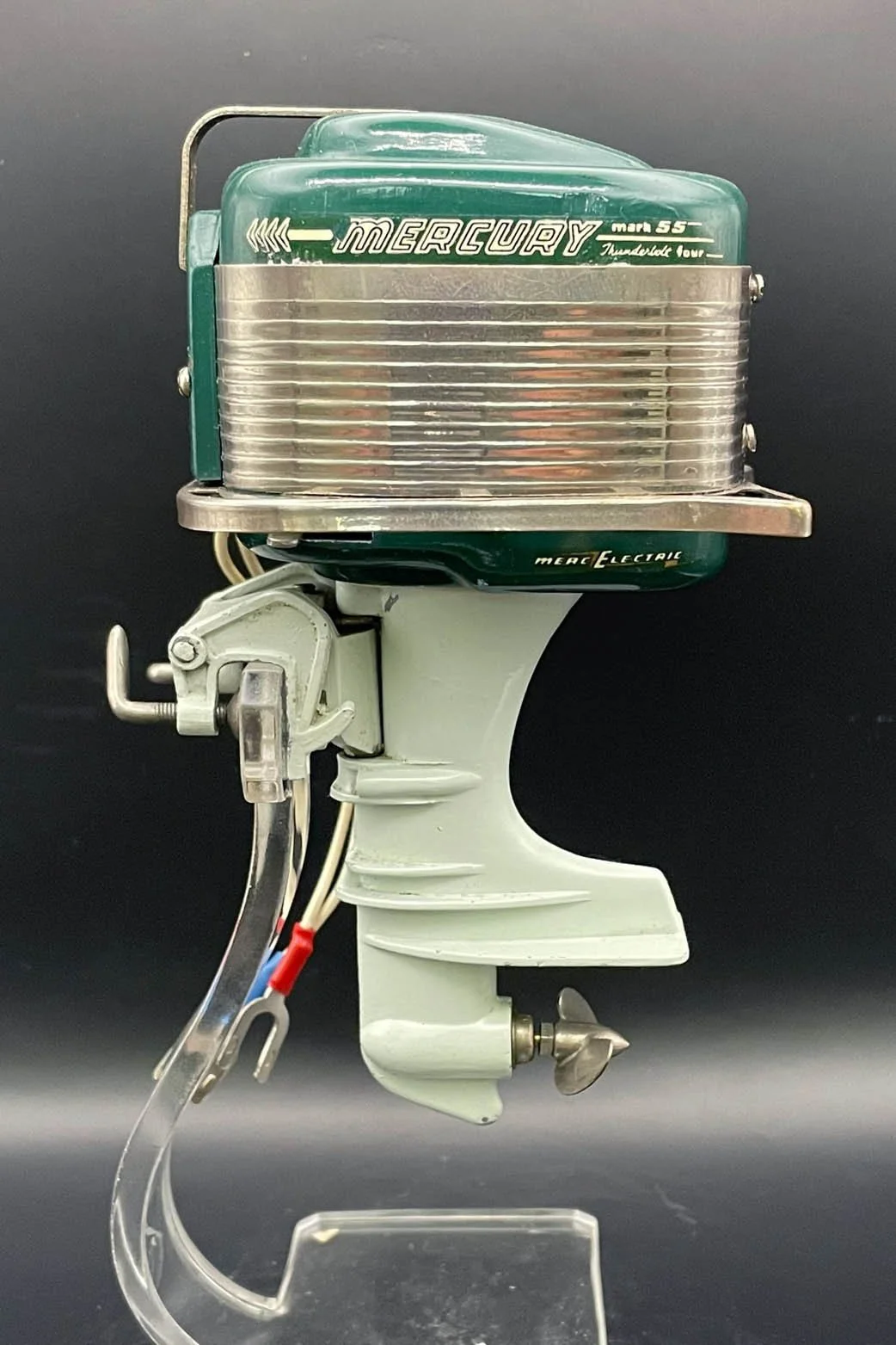 This motor shares the same design and coloring as the 1957 Mark 75. The only update for the Mark 78 was a slightly thinner “Mercury” cowl decal and a faceplate decal showing “Mark 78”. This Mercury is much rarer than the 1957 Mark 75 motor but, not as rare as the two 1958 Mark 55 motors. Like many 6-cylinder Mercury motors, these are rarely seen for sale.