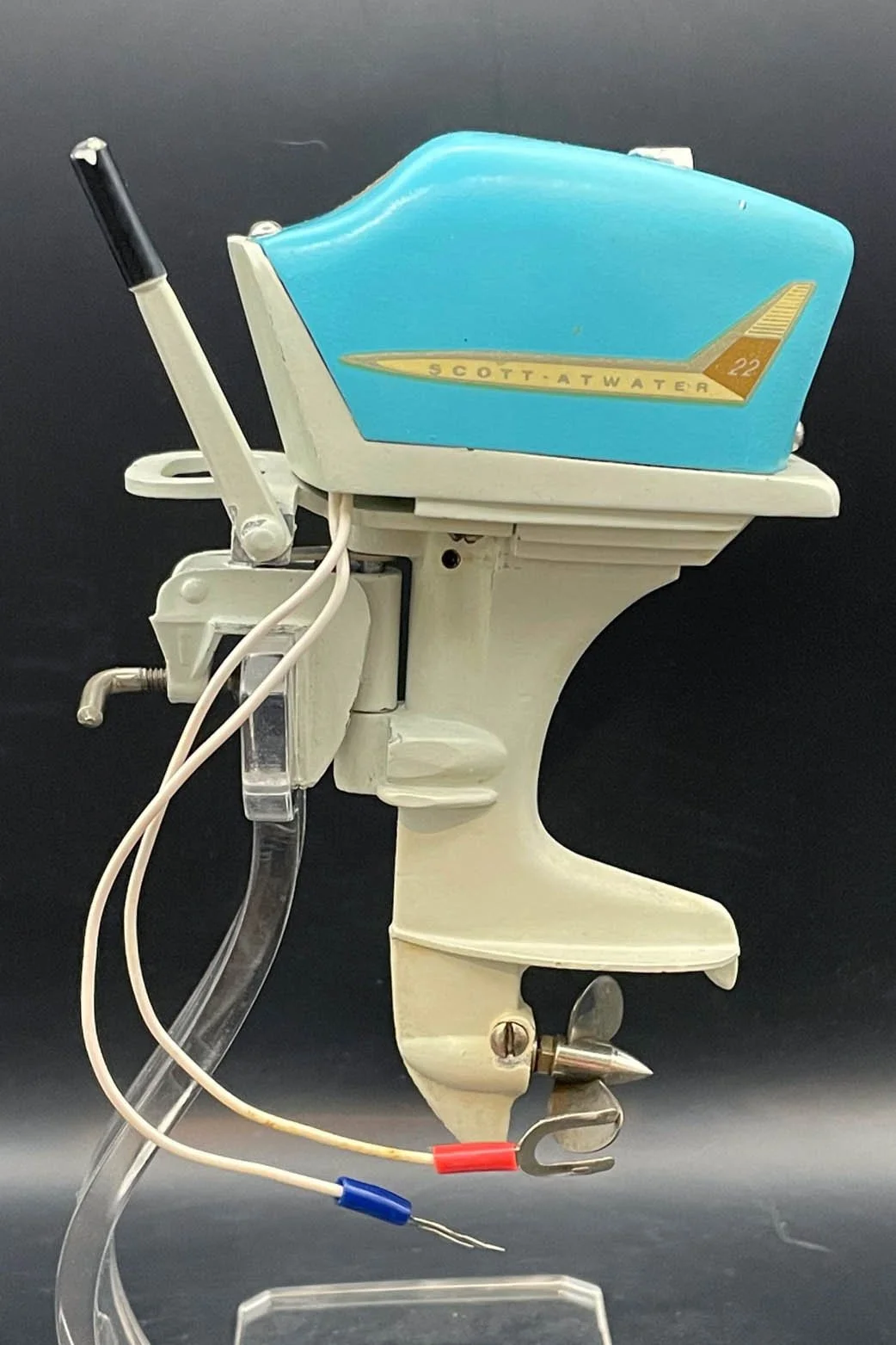 The 22HP is one of the rarest K&O motors available and the first “small” Scott-Atwater offered. This motor is highly desirable and very valuable. The motor mimics the look of the larger HP version with simplified design and construction. This motor is the only blue Scott-Atwater available from K&O. This motor came in a very rare “painted” box with a red Scott-Atwater motor facing away from the viewer on the cover. This 1958 model also came with a very rare small aluminum spacer for the transom bracket.