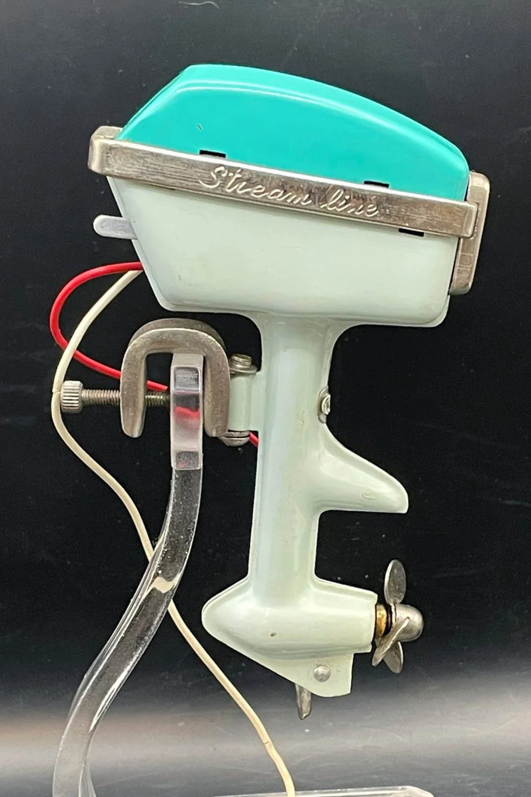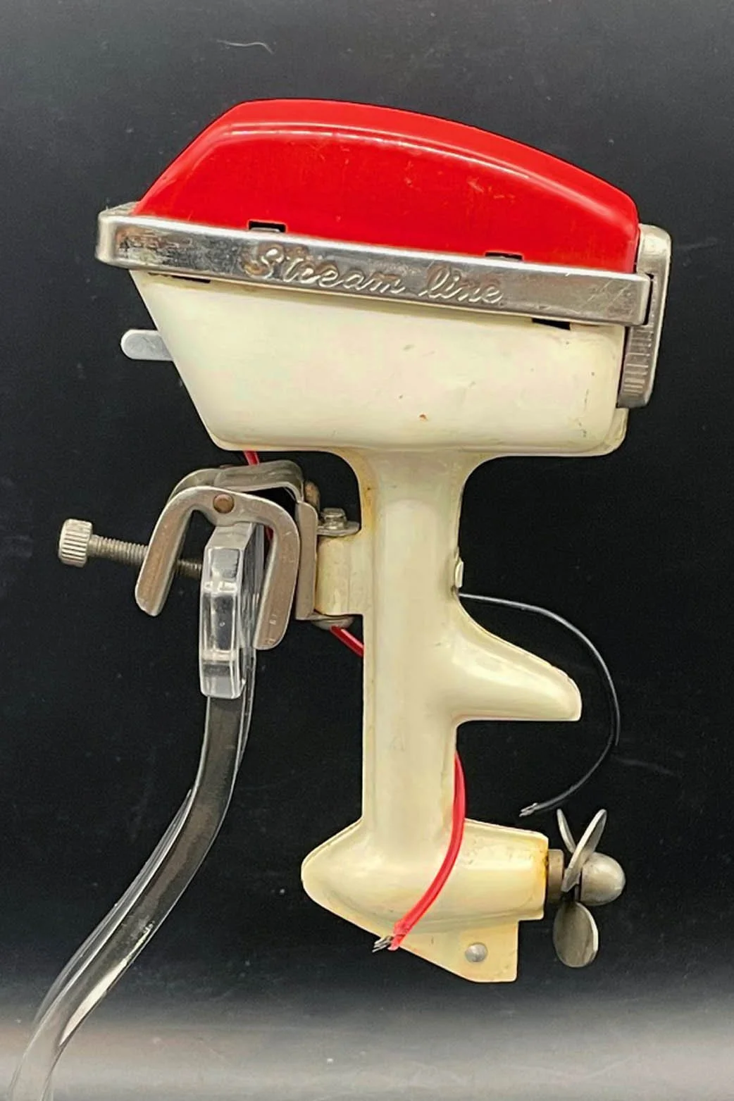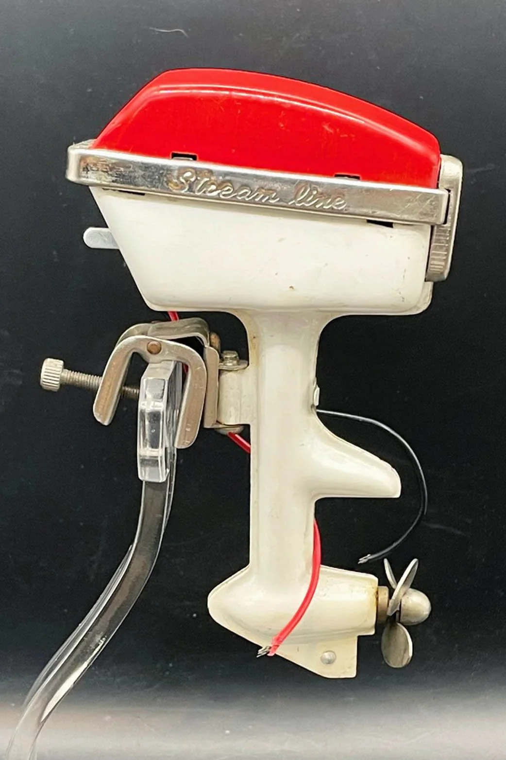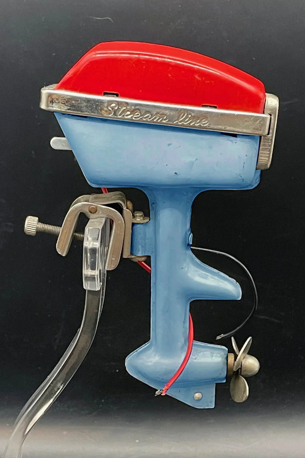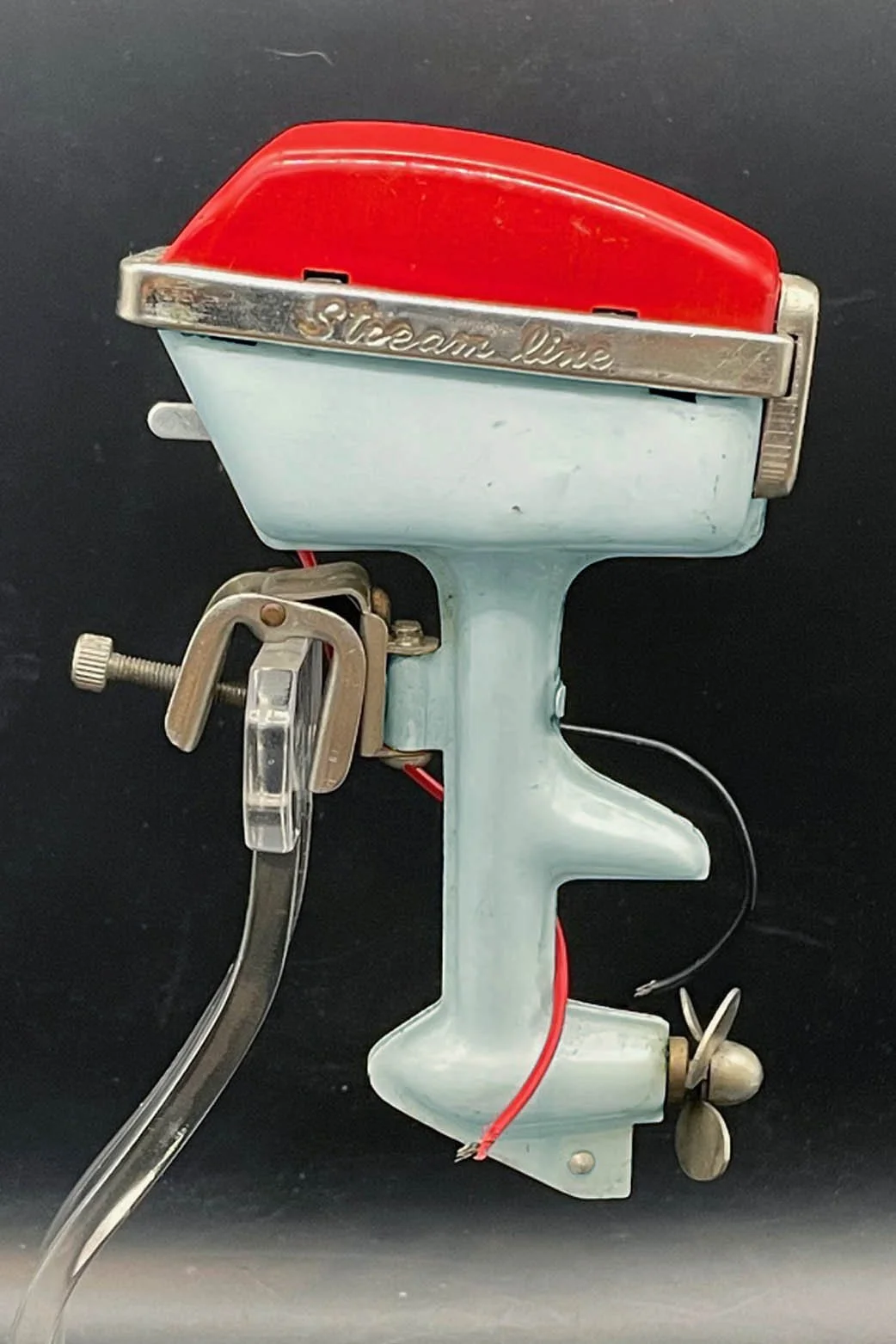 The Stream Line OB-5 motors came in 7 different color combinations. These are Mermaid motors, but each motor was branded with “Stream Line” on the trim ring. The Stream Line motors were all the same style with some differences in materials used for construction. The teal and light blue version of this motor is one of the rarer versions and had all metal construction. This color combo was originally only available in combination with a similar color small wood boat. These motors were mainly held together with thin metal tabs and a single rivet in the lower skeg. All OB-5 motors came with red and black battery wires with pin-style terminals and a faceplate toggle-style on/off switch. The box for the OB-5 motor is the primarily orange smaller box with the Mermaid logo and “Stream Line” text in the red Mermaid shield on the cover. The box also carries the “Type OB-5” text just under the Mermaid shield. The same box design was also used for the Type OB-3 and some Type OB-6 motors with minor differences to respective “Types”. The OB-5 motors have a lower desirability and overall value as they have cheaper construction and minimal detail.