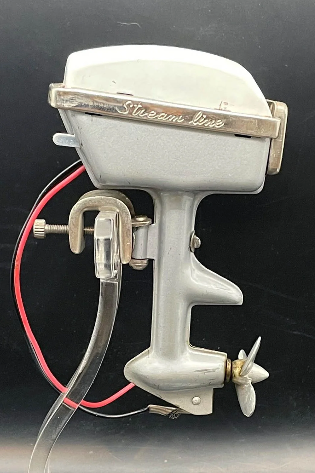 The Stream Line OB-5 motors came in 7 different color combinations. These are Mermaid motors, but each motor was branded with “Stream Line” on the trim ring. The Stream Line motors were all the same style with some differences in materials used for construction. The white and silver version of this motor is one of the less common available and had two construction versions. One version was all metal construction, and the other has a plastic white top cowl. The white and silver motor is the only version available with only a silver plastic prop. These motors were mainly held together with thin metal tabs and a single rivet in the lower skeg. All OB-5 motors came with red and black battery wires with pin-style terminals and a faceplate toggle-style on/off switch. The box for the OB-5 motor is the primarily orange smaller box with the Mermaid logo and “Stream Line” text in the red Mermaid shield on the cover. The box also carries the “Type OB-5” text just under the Mermaid shield. The same box design was also used for the Type OB-3 and some Type OB-6 motors with minor differences to respective “Types”. The OB-5 motors have a lower desirability and overall value as they have cheaper construction and minimal detail.