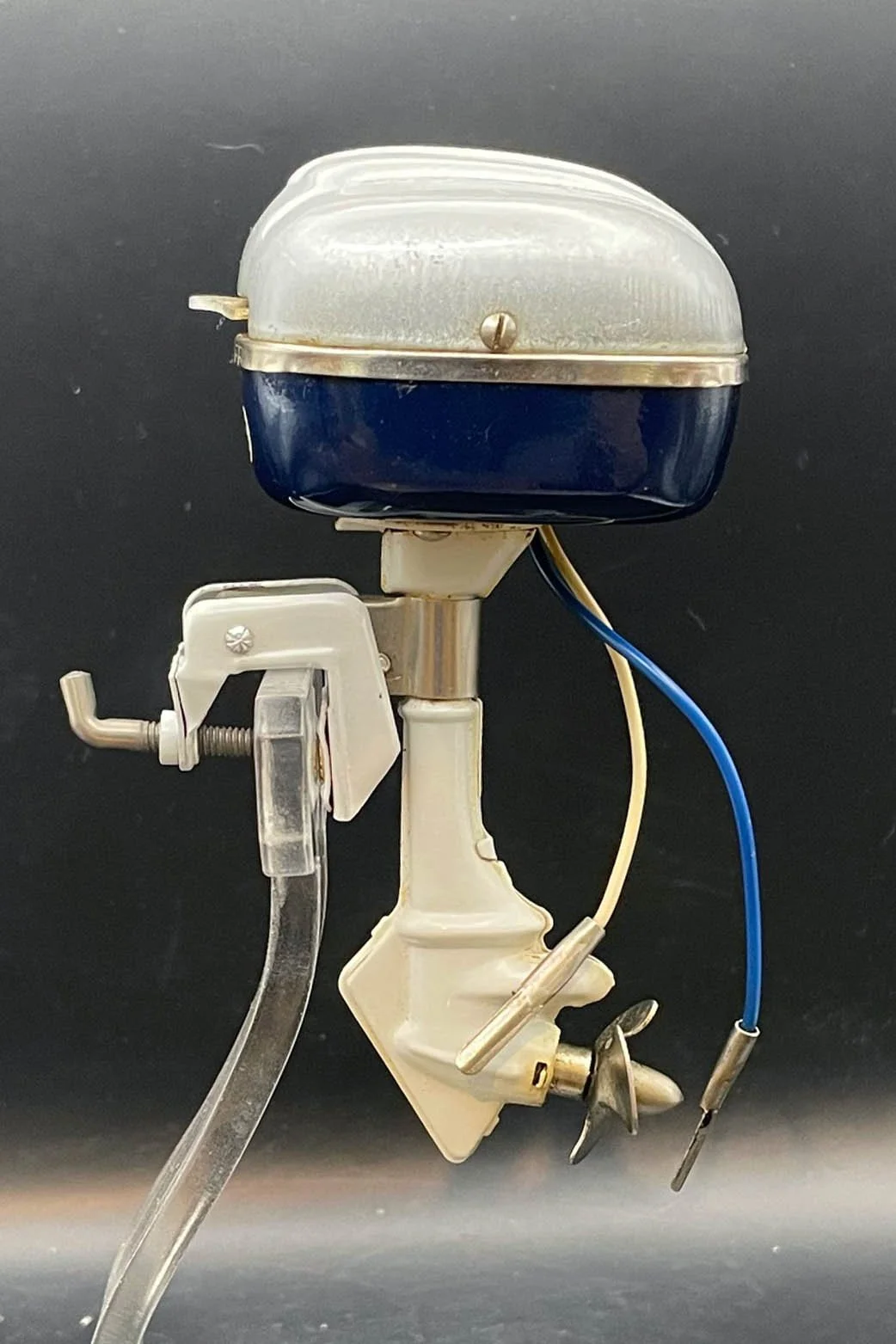 The Sakai Seisakusho RICO outboard motor is a unique motor from the Sakai manufacturer. The RICO outboard features a debossed white painted “RICO” brand, white and blue battery wires with pin-style terminals, a silver, deep blue and white paint scheme and a front mounted toggle on/off switch. This motor only has one transom screw and cup due to its smaller size. The overall height of this motor is approximately 4 inches. Unfortunately, not much is known about these motors original packaging or if it was offered in combination with any boats. This unique RICO motor is rare and fairly unknown amongst many collectors. These motors had a more simplistic mechanical design but, are still semi-difficult to work on due to their very small spring drive drivetrains. These motors are rare but, their simplistic look, small size and unpopular branding keep their values on the lower end of the spectrum.