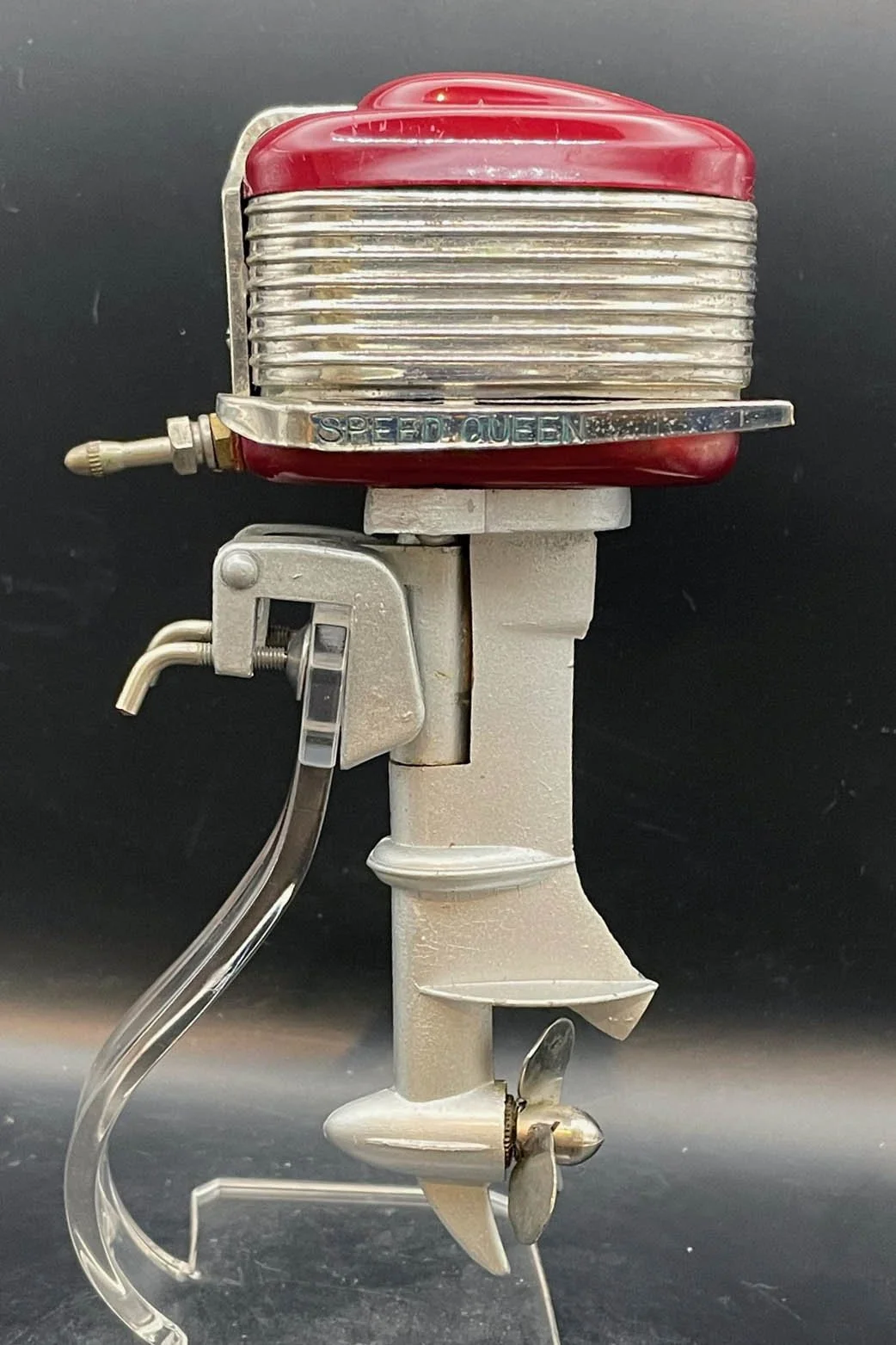 The Sakai Seisakusho RICO Speed Queen motor is one of two very similar motors available from the Sakai manufacturer. The RICO Speed Queen and RICO Speed King are the same motors with the differences being the name stamping and faceplates. The RICO Speed Queen and RICO Speed King are similar in rarity, and both are far rarer than the blue Sakai motors. The RICO Speed Queen can be recognized by its unbranded faceplate, “SPEED QUEEN” name stamped in the chrome trim ring, and the cowl’s deep red coloring. These RICO outboards came with very similar but slightly different lower units as the blue Sakai motors. The RICO Speed Queen and Speed King did not have a remote steering bracket or side tiller handle. The tiller handle for this motor is located on the front of the motor between the battery terminals and was the on/off switch for this motor. These motors shared a very similar cowl and faceplate construction with the 1955 K&O Mercury outboards. The transom cups on this motor are slightly larger and have a thin flange around the base of the cup. The props on these outboards were also pressure fit from the manufacturer and once they are removed, they are extremely difficult to reattach correctly. Unlike the blue Sakai motors, these motors had a more simplistic mechanical design are easier to repair/work on. Neither the RICO Speed Queen or King motors came with attached battery wires and were fitted with threaded wire terminals and hexagon wire nuts. Although the RICO Speed Queen was very similar in design to a Mercury outboard, these motors never carried the “Mercury” branding. Both the RICO Speed Queen and RICO Speed King came in the same box featuring a race boat graphic, teal and dark blue coloring and “Speed Motor” written in red script. Unknown if the RICO outboards also came with a unique clear plastic stand with an “arrow” shaped base as seen with the SPEED motor. These stands are fairly rare and highly sought after.