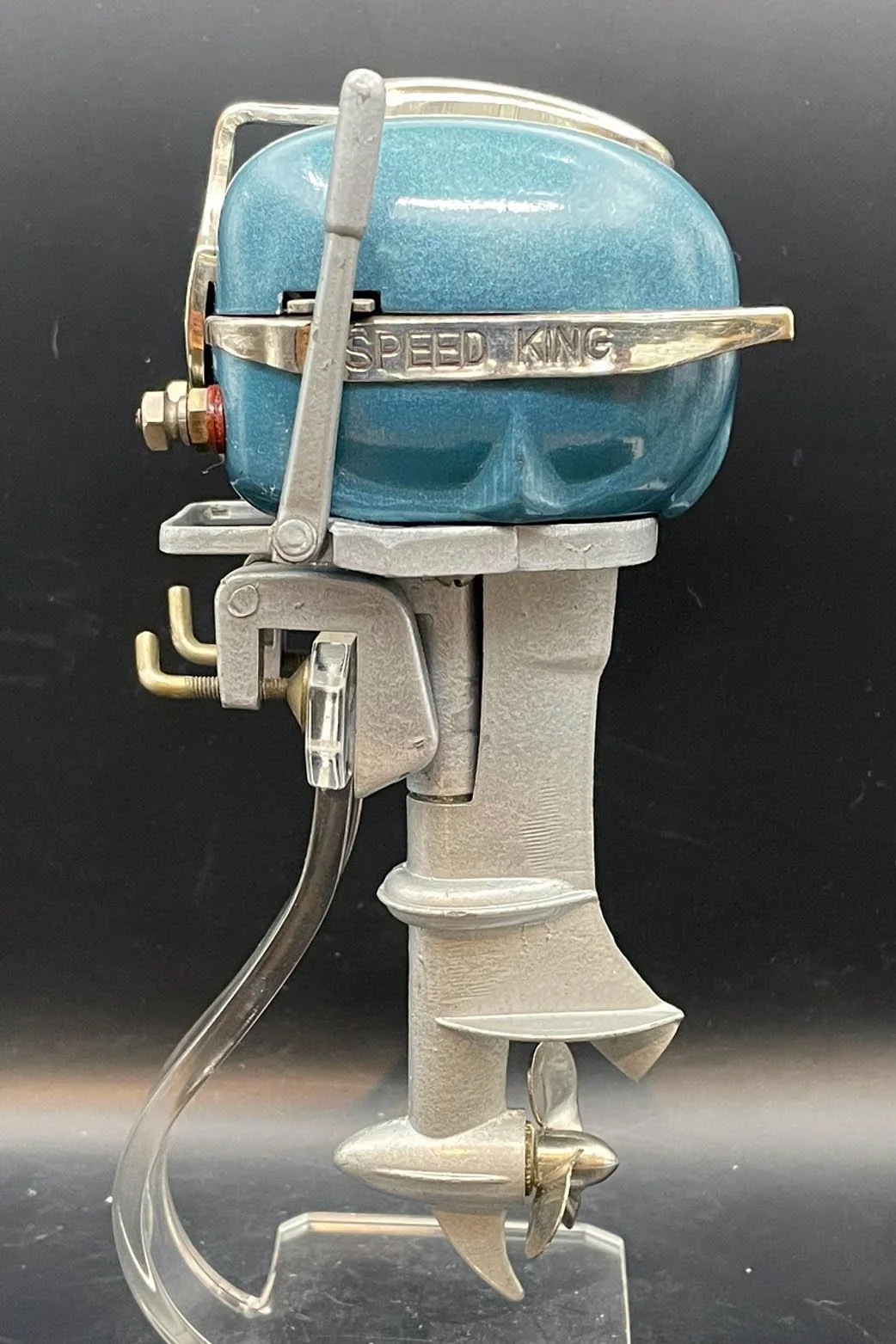The Sakai Seisakusho Speed King motor is one of three very similar motors available from the Sakai manufacturer. The Speed King, SPEED and Wolf Cub are all the same motor with minor differences in branding and a slightly different shades of blue on each cowl. The Speed King version is the most common of the three and none of these motors are particularly rare. The Speed King can be recognized by its RICO branded faceplate, “SPEED KING” name stamped in the chrome trim ring, and the cowl’s steal blue color. The Speed King name stamping was not painted like the SPEED motors stamping. The Sakai outboards also came with very similar but different transom cups than other manufacturers. The cups are slightly larger and have a thin flange around the base of the cup. The props on these outboards were also pressure fit from the manufacturer and once they are removed, they are extremely difficult to reattach correctly. Even though the Sakai motors resemble the 1954 K&O Evinrude models in both shape and size, these motors are far more complex and difficult to work on. None of the Sakai motors came with attached battery wires and were fitted with threaded wire terminals and hexagon wire nuts. The Sakai outboards also feature a side-cowl on/off switch that is activated when lowering the tiller handle. These motors also have an added chrome teardrop shaped dome on top of the cowl. The Speed King outboard was also available in a brightly colored yellow and teal box featuring the “SPEED MOTOR” branding and a graphic of a race boat. The Speed King may have come with a unique clear plastic stand with an “arrow” shaped base. It is unknown if this motor and the Wolf Cub came with a stand like the SPEED motor. These stands are fairly rare and highly sought after.