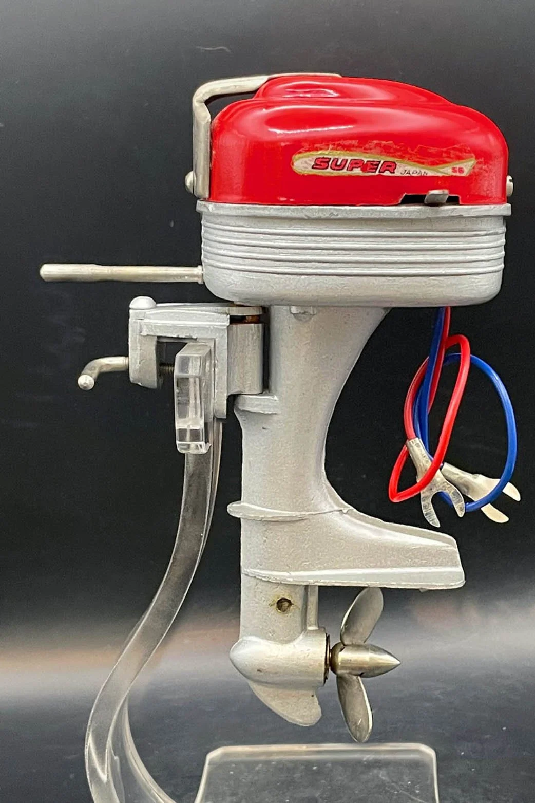 The Super 55 “Super Outboard Motor” is one of a few motor lines that carry the “SUPER” name in their branding. The oldest or first versions of these Super 55 motors have battery terminal posts with knurled wire nuts on a banded faceplate. These early motors came in two cowl color versions - one red and one green. Although these motors were never granted rights to the Mercury name or branding, the manufacture bowered a lot of styling form the early Mercury motor designs and logo. The “Super 55” Mercury-style “airplane” decal on each side of the cowl remained unchanged through all years of production for this line of motors. All production years of these motors came with very similar silver lower portion and a tiller arm extending from the front of the cowl above the transom bracket. The transom bracket itself was a single screws and cup set up with multi-angle and pitch articulation. Both the red and green terminal-post versions of this motor came in a brightly colored blue and white box with motor graphics on the front featuring the red cowl and silver lower. The motor graphics on the correct box for the early versions of this motor show the post terminals on the faceplate. There are no manufacturing marks on the box or motors other than “Japan” but, given the similar castings found on other motors, it is presumed that these Super 55 motors were produced by the Sekai Seisakusho company in Japan during the mid-late 1950’s. Although these motors are very rare and have many Mercury branding and styling traits, currently they do not demand similarly high values as seen for other rare Mercury motors. These motors are still semi-unknown to the collecting community.
